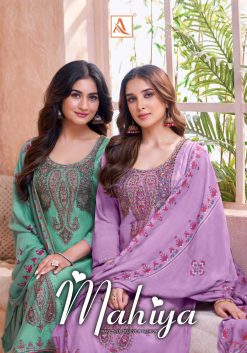 Alok Mahiya Indian Suit Catalog 4 pcs of Viscose Muslin Rayon quality Shop Ethnic salwar Kameez Buy online Alok Brand Chudidar Dress Materials from Surat’s biggest Wholesaler