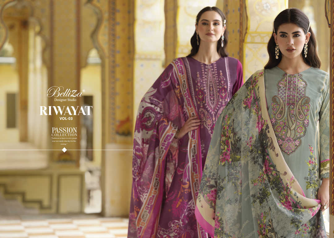 Belliza Riwayat Vol 3 “Suratfabric.com” aims to be a leading e-whole-selling fashion brand. Engaged in selling luxury hi–fashion ethnic brand. Delivering Wholesale Suit Sarees, Salwar Kameez & Kurtis etc. We promise to keep fashion real. We focus on creating exotic catalogs with appealing brands. Our catalog comprises top class brands, which cover huge collection of designs. Our one and only aim is to blend comfort with style when it comes to tradition. These ladies wear are renowned for supreme quality fabric. Range of attractive colors & sizes and latest trend. We export our complete range of ladies wear to our valuable clients throughout the world. We sell extreme quality material in our range of products, which is sourced from our quality driven and reliable vendors. Wherever you are, come join the experience of our enhanced fashionable Shopping mart.