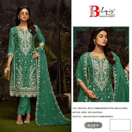 About this product: Bilqis B 138 A-D Salwar Suit Catalog 4 pcs is from Bilqis Brand. We are selling it at lowest & cheapest Wholesale prices. It’s made of Organza Shantoon qualities. The manufacturer is well known and the quality is pre-tested and checked.