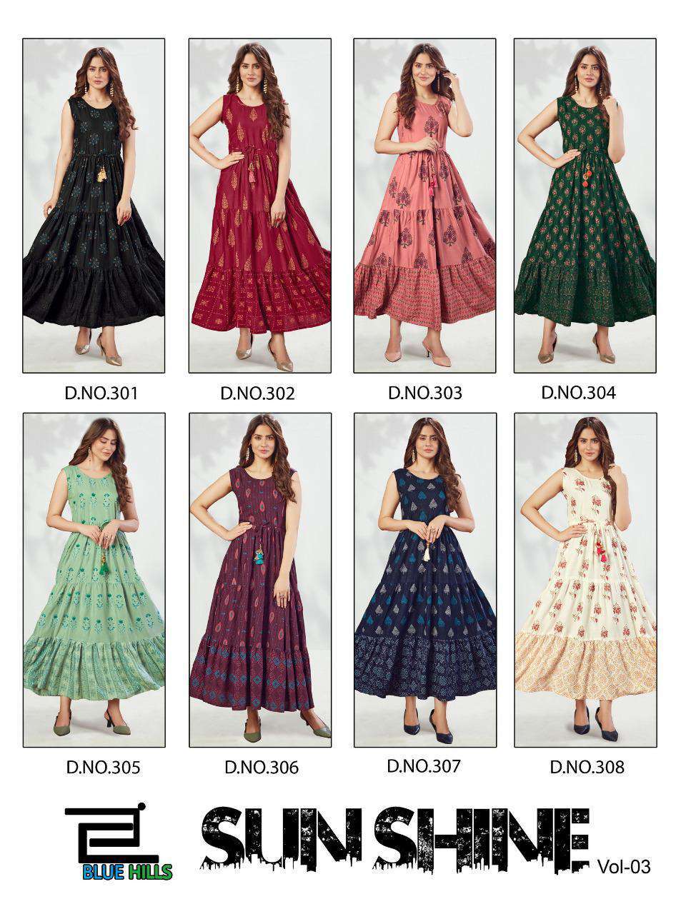 Blue Hills Sun Shine Vol 3 Shop Online Ethnic Kurti Catalog 8 pcs. Wholesale Blue Hills Indian Kurtis. We deal in Kurtis, Sarees, Dresses Materials, Leggings, Designer salwar kameez.