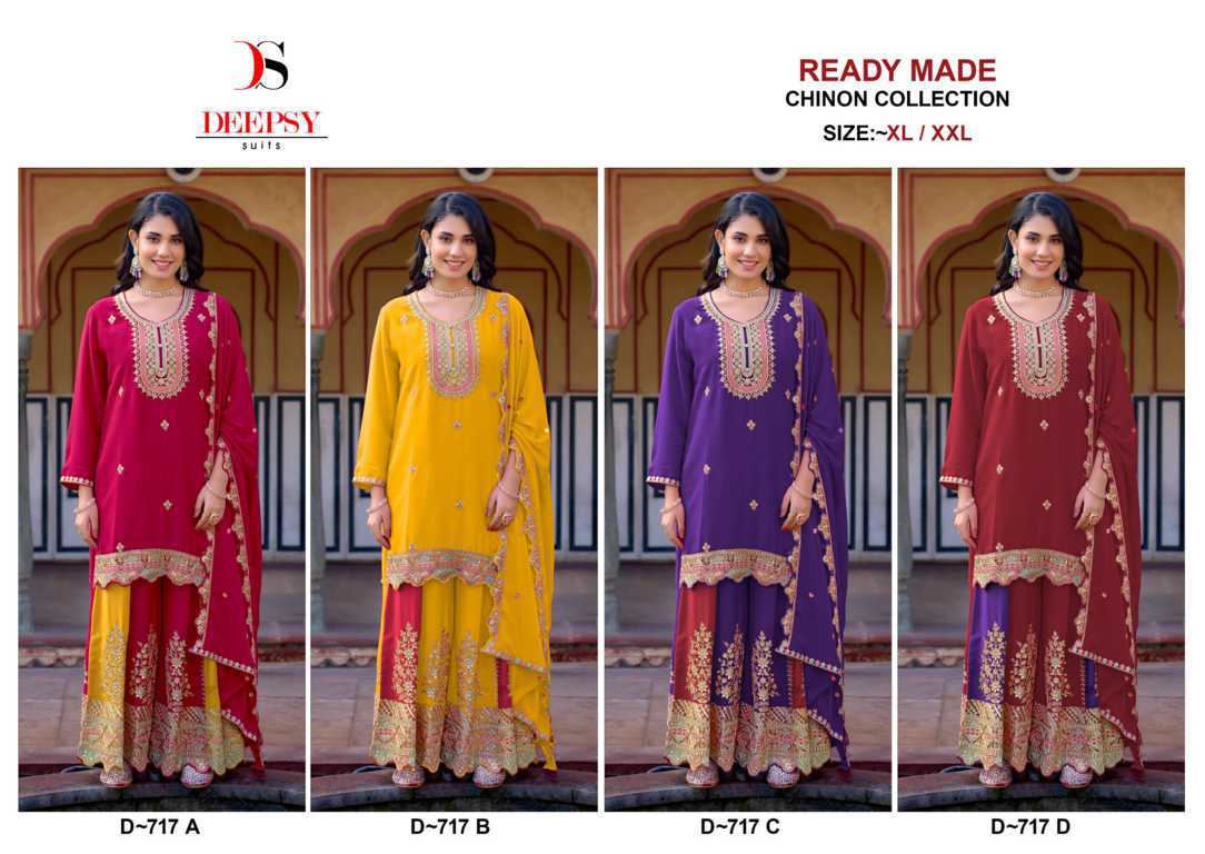 Deepsy DN 717 A-D “Suratfabric.com” aims to be a leading e-whole-selling fashion brand. Engaged in selling luxury hi–fashion ethnic brand. Delivering Wholesale Suit Sarees, Salwar Kameez & Kurtis etc. We promise to keep fashion real. We focus on creating exotic catalogs with appealing brands. Our catalog comprises top class brands, which cover huge collection of designs. Our one and only aim is to blend comfort with style when it comes to tradition. These ladies wear are renowned for supreme quality fabric. Range of attractive colors & sizes and latest trend. We export our complete range of ladies wear to our valuable clients throughout the world. We sell extreme quality material in our range of products, which is sourced from our quality driven and reliable vendors. Wherever you are, come join the experience of our enhanced fashionable Shopping mart.