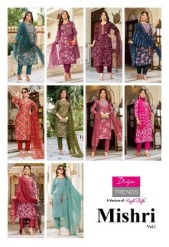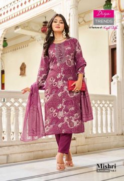 Diya Trends Mishri Vol 1 “Suratfabric.com” aims to be a leading e-whole-selling fashion brand. Engaged in selling luxury hi–fashion ethnic brand. Delivering Wholesale Suit Saree, Salwar Kameez & Kurti etc. We promise to keep fashion real. We focus on creating exotic catalogs with appealing brands. Our catalog comprises top class brands, which cover huge collection of designs. Our one and only aim is to blend comfort with style when it comes to tradition. These ladies wear are renowned for supreme quality fabric. Range of attractive colors & sizes and latest trend. We export our complete range of ladies wear to our valuable clients throughout the world. We sell extreme quality material in our range of products, which is sourced from our quality driven and reliable vendors. Wherever you are, come join the experience of our enhanced fashionable Shopping mart.