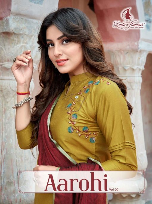 About this product: Ladies Flavour Aarohi Vol 2 Kurti Catalog 8 pcs is from Ladies Flavour Brand. We are selling it at lowest & cheapest Wholesale prices. It’s made of Banarasi qualities. The manufacturer is well known and the quality is pre-tested and checked.
