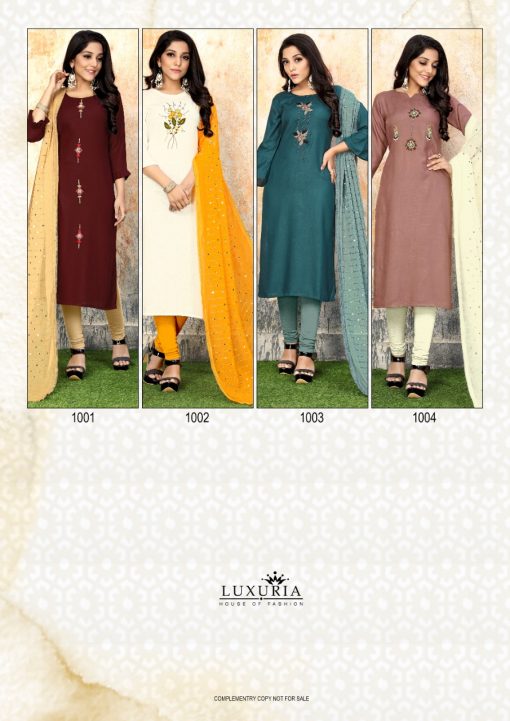 About this product: Luxuria Sathiya Kurti Catalog 4 pcs is from Luxuria Brand. We are selling it at lowest & cheapest Wholesale prices. It’s made of Rayon Slub Nazneen qualities. The manufacturer is well known and the quality is pre-tested and checked.