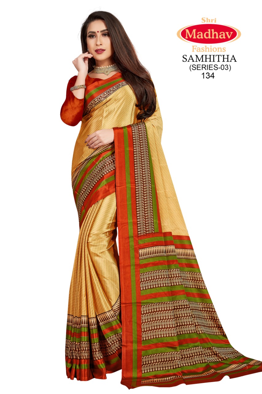 About this product: Madhav Fashion Samhitha Vol 3 Saree Catalog 9 pcs is from Madhav Fashion Brand. We are selling it at lowest & cheapest Wholesale prices. It’s made of Turkey qualities. The manufacturer is well known and the quality is pre-tested and checked.