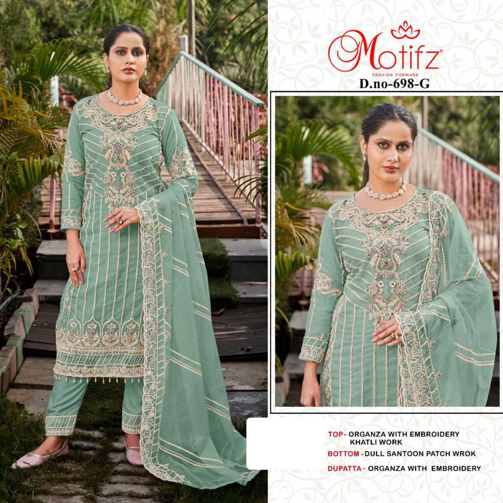 About this product: Motifz DN 698 Salwar Suit Catalog 4 pcs is from Motifz Brand. We are selling it at lowest & cheapest Wholesale prices. It’s made of Organza Shantoon qualities. The manufacturer is well known and the quality is pre-tested and checked.