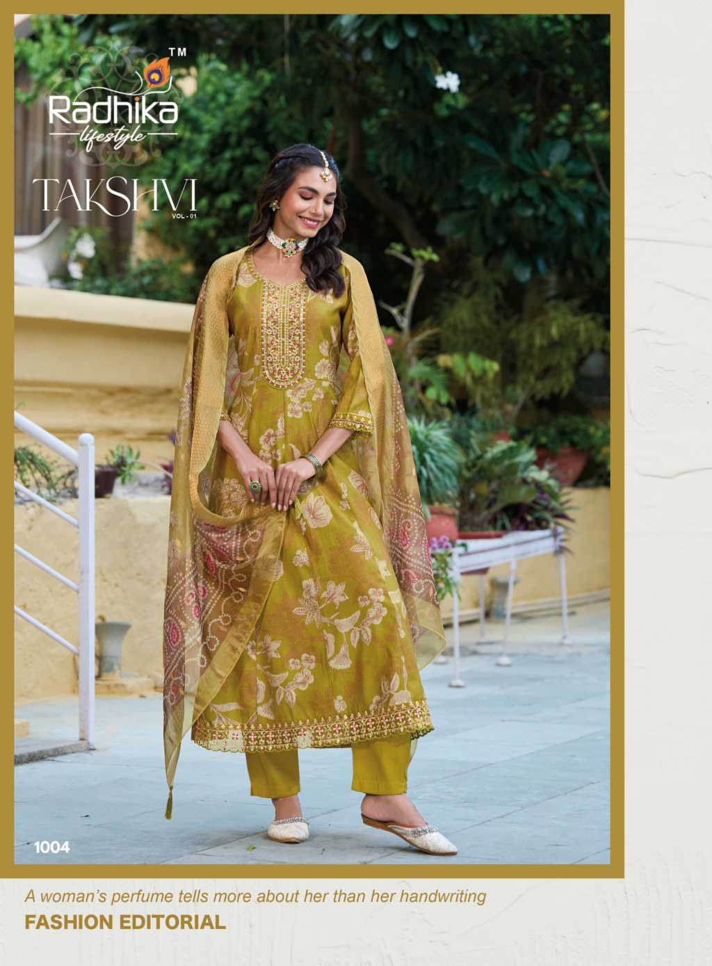 Radhika Takshvi Vol 1 “Suratfabric.com” aims to be a leading e-whole-selling fashion brand. Engaged in selling luxury hi–fashion ethnic brand. Delivering Wholesale Suit Saree, Salwar Kameez & Kurti etc. We promise to keep fashion real. We focus on creating exotic catalogs with appealing brands. Our catalog comprises top class brands, which cover huge collection of designs. Our one and only aim is to blend comfort with style when it comes to tradition. These ladies wear are renowned for supreme quality fabric. Range of attractive colors & sizes and latest trend. We export our complete range of ladies wear to our valuable clients throughout the world. We sell extreme quality material in our range of products, which is sourced from our quality driven and reliable vendors. Wherever you are, come join the experience of our enhanced fashionable Shopping mart.