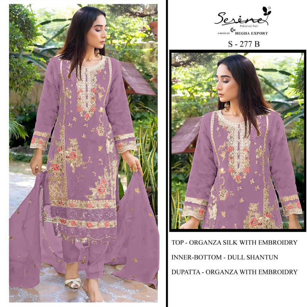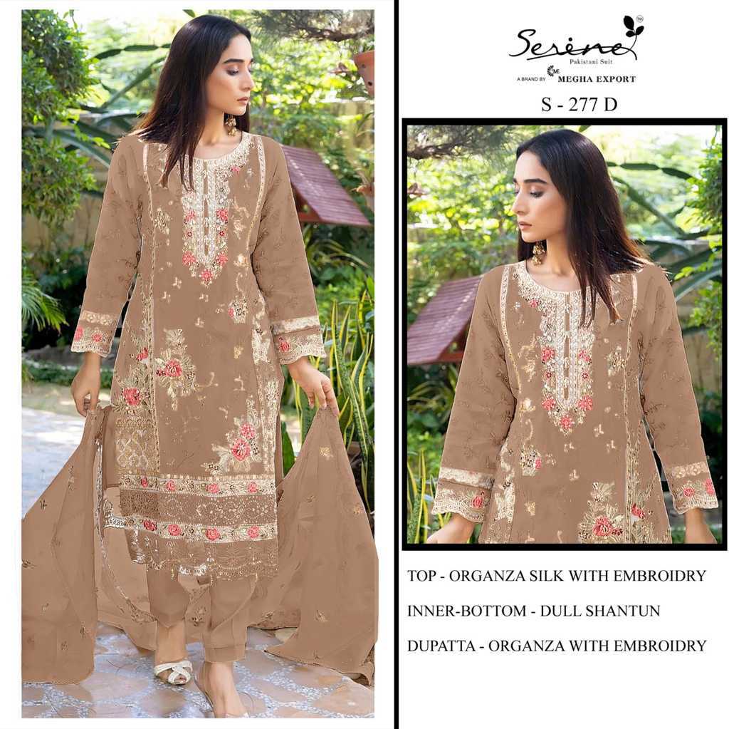 About this product: Serene S 277 A-D Salwar Suit Catalog 4 pcs is from Serene Brand. We are selling it at lowest & cheapest Wholesale prices. It’s made of Organza Shantoon qualities. The manufacturer is well known and the quality is pre-tested and checked.