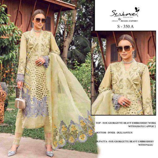 About this product: Serene S 350 A-D Salwar Suit Catalog 4 pcs is from Serene Brand. We are selling it at lowest & cheapest Wholesale prices. It’s made of Georgette Shantoon qualities. The manufacturer is well known and the quality is pre-tested and checked.