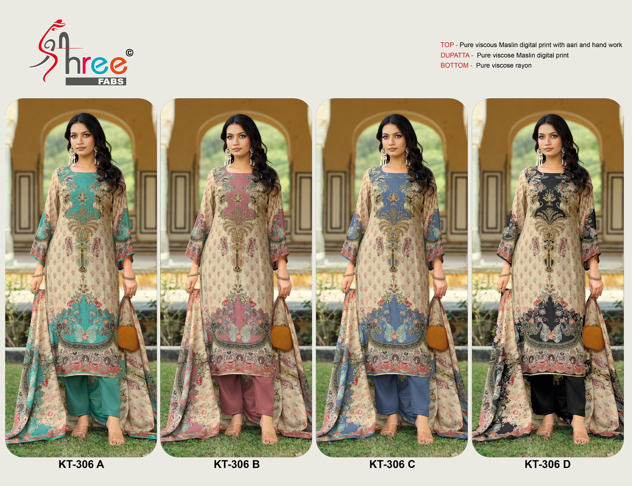 About this product: Shree Fabs KT 306 Salwar Suit Catalog 4 pcs is from Shree Fabs Brand. We are selling it at lowest & cheapest Wholesale prices. It’s made of Viscose Muslin Rayon qualities. The manufacturer is well known and the quality is pre-tested and checked.
