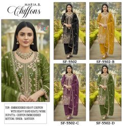 About this product: Shree Fabs Maria B Chiffons SF 5502 A-D Salwar Suit Catalog 4 pcs is from Shree Fabs Brand. We are selling it at lowest & cheapest Wholesale prices. It’s made of Chiffon Shantoon qualities. The manufacturer is well known and the quality is pre-tested and checked.