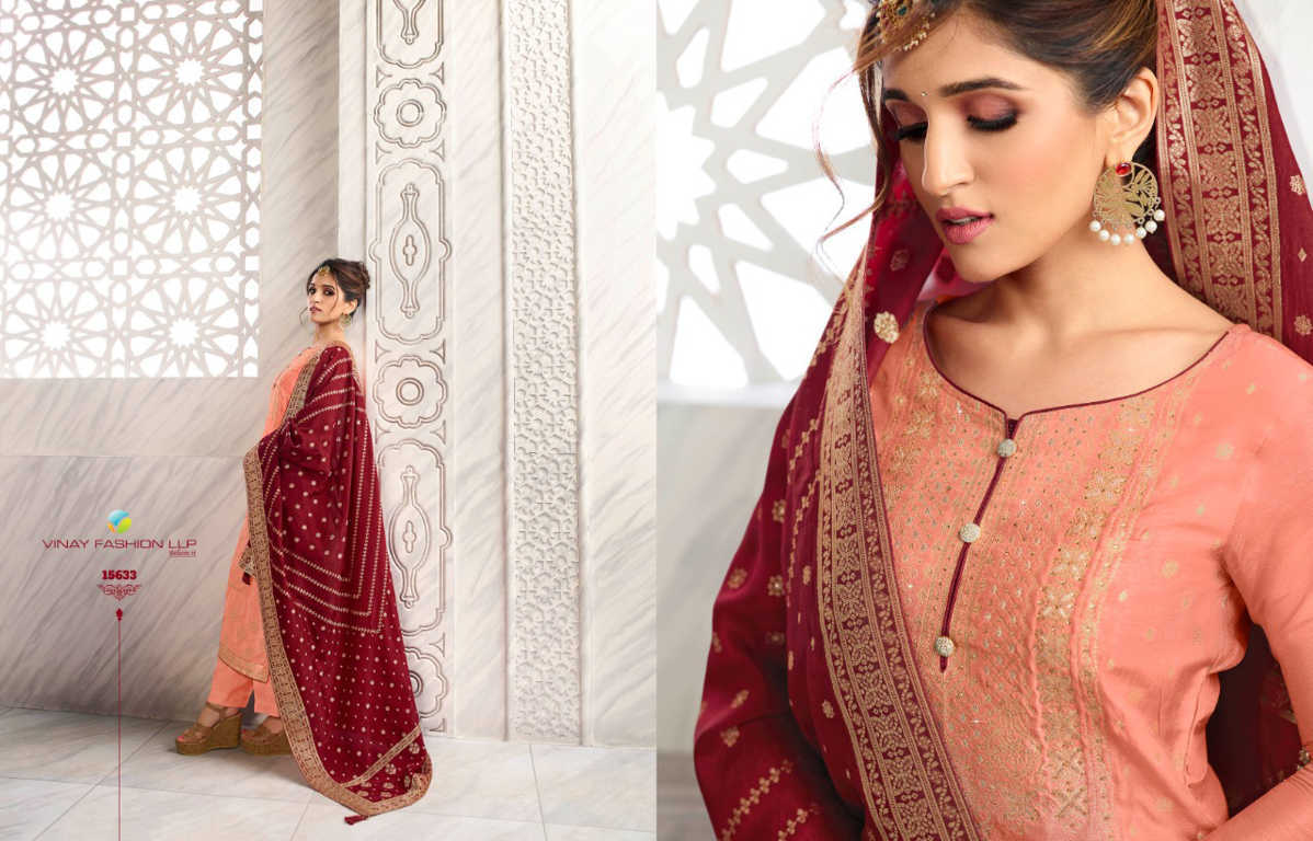 Vinay Kaseesh Zardosi Vol 2 Indian Suit Catalog 6 pcs of Dola Silk Jacquard quality Shop Ethnic salwar Kameez Buy online Vinay Brand Chudidar Dress Materials from Surat’s biggest Wholesaler