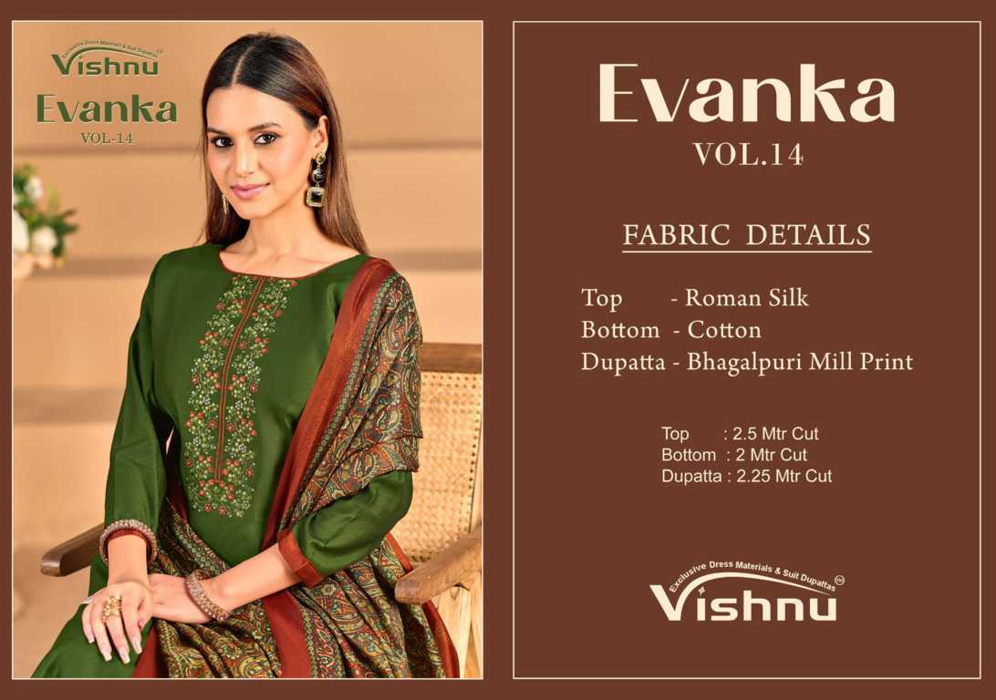 Vishnu Evanka Vol 14 Indian Suit Catalog 12 pcs of Silk Cotton Bhagalpuri quality Shop Ethnic salwar Kameez Buy online Vishnu Brand Chudidar Dress Materials from Surat’s biggest Wholesaler