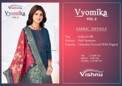 About this product: Vishnu Vyomika Vol 2 Salwar Suit Catalog 12 pcs is from Vishnu Brand. We are selling it at lowest & cheapest Wholesale prices. It’s made of Silk Shantoon Jacquard Chanderi qualities. The manufacturer is well known and the quality is pre-tested and checked.